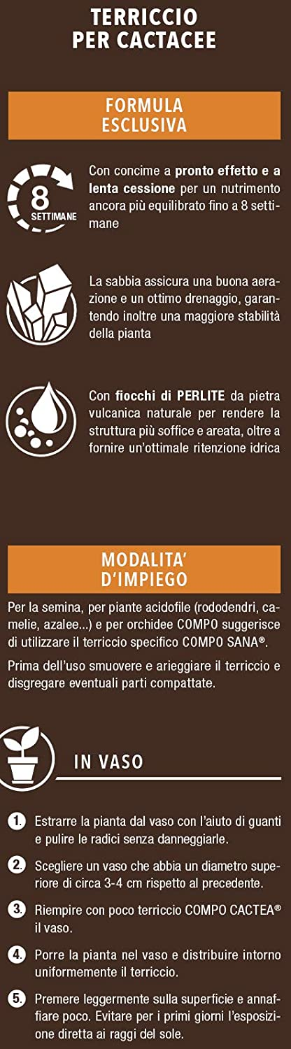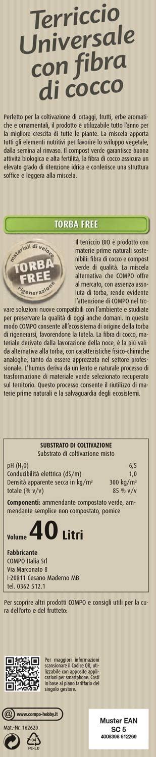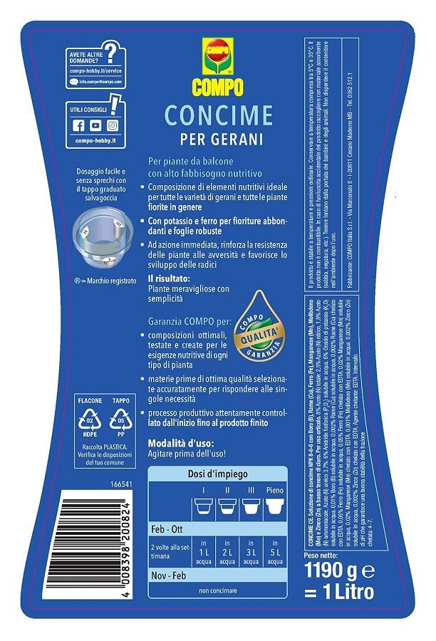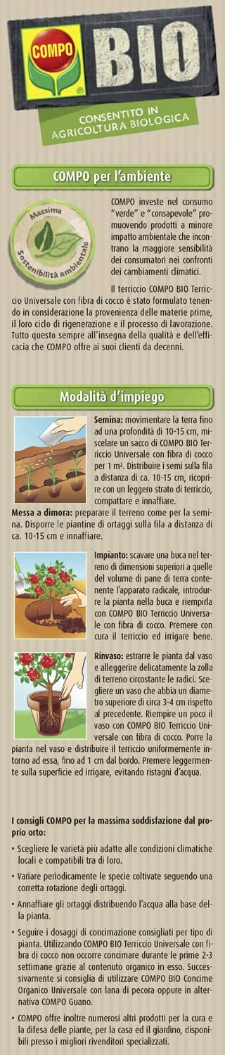 COMPO BIO Stallatico Pellettato ha una formulazione di materie prime consentite in agricoltura Biologica detivanti dal letame maturo di antica tradizione contadina (non proveniente da allevamenti industirali), del quale grazie alla rilavorazione in chiave moderna è in grado di mantenere intatte, tutte le benefiche caratteristiche e gli elementi nutritivi, gli acidi umici e fulvici.La flora batterica, propria dell’humus, viene infatti preservata grazie alla disidratazione a bassa temperatura Inoltre è esente da salmonelle e germi patogeni. La forma pellettata ne facilita la distribuzione. COMPO Bio Stallatico Pellettato migliora la struttura del terreno, arricchendolo anche di sostanze nutritive e garantisce raccolti abbondanti e rigogliosi. Modalità d’uso: Utilizzare in sostituzione della tradizionale letamazione dei terreni agricoli, alla dose 150 – 200 g/m2 riducendo del 30% la concimazione chimica. Interrare leggermente dopo lo spandimento. Colture orticole: 1-1,5 kg/10 m2 in pre-semina/pre-trapiantoColture floreali: 1-1,5 kg/10 m2 in pre-semina/pre-trapiantoTappeti erbosi: max 1-1,5 kg/10 m2 in fase di preparazione del terrenoPiante da frutto: 1 kg per pianta in pre-impianto; 500 g per pianta durante il ciclo colturale Le indicazioni di riferimento delle singole colture sono prettamente orientative e modificabili in relazione ai fabbisogni, ai livelli di fertilità ed alle disposizioni previste dalle varie normative. Composizione: COMPO BIO Stallatico Pellettato AMMENDANTE – letame bovino ed equino Umidità 14% Carbonio organico di origine biologica 26% Azoto totale 1% Rapporto C/N 26